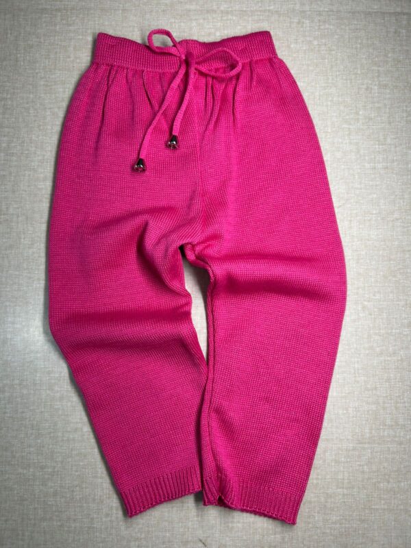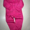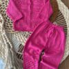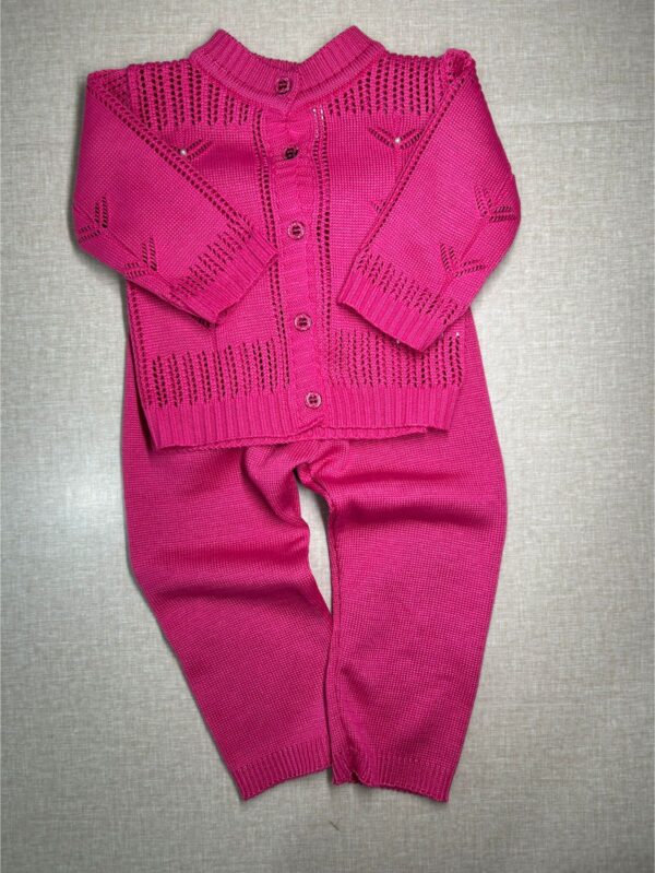 Conjunto em tricô com casaquinho de manga longa e calça.
