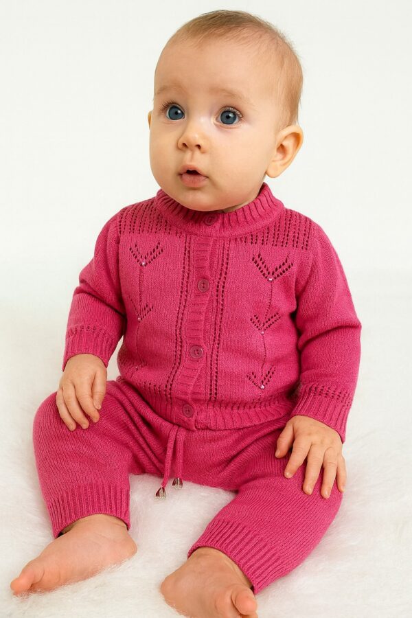 Esse conjunto em tricô para bebê é a escolha ideal para quem busca qualidade, aconchego e um visual delicado. Confeccionado com linha antialérgica, é suave para a pele sensível do bebê e proporciona liberdade de movimento. O casaquinho possui fechamento frontal em botões, facilitando na hora de vestir. A calça tem modelagem confortável que se adapta ao corpo do bebê.