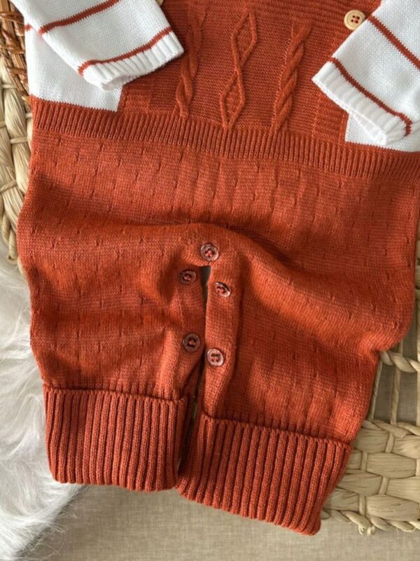 A parte inferior conta com botões entre as pernas que facilitam na hora de vestir e na troca de fraldas. A peça é inteiriça e veste como um macacão completo.