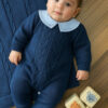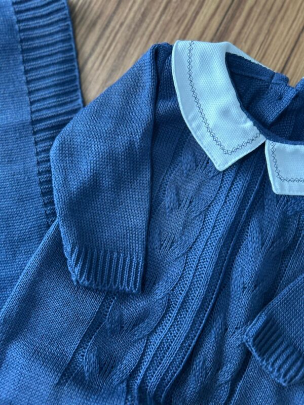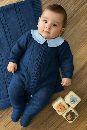 Essa saída maternidade é composta por macacão em tricô com pés fechados e manta de tricô, proporcionando praticidade, aconchego e um visual delicado para o bebê.