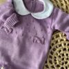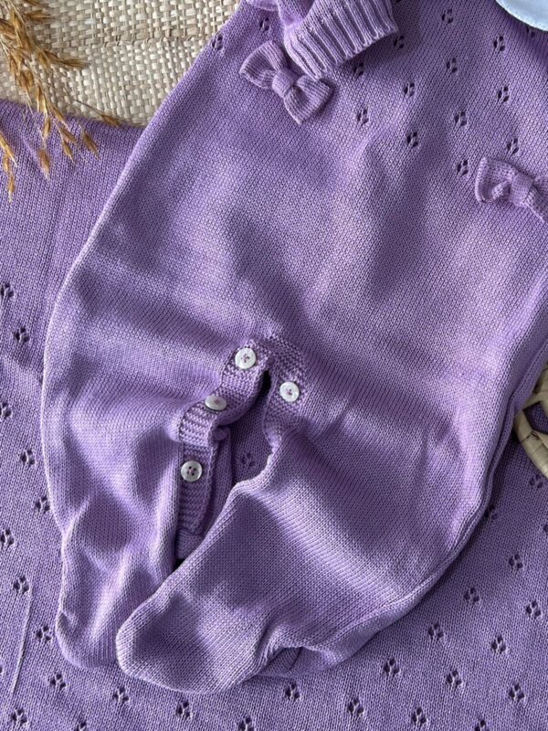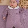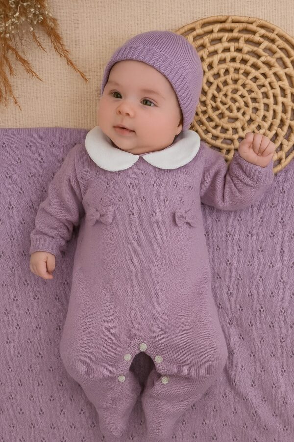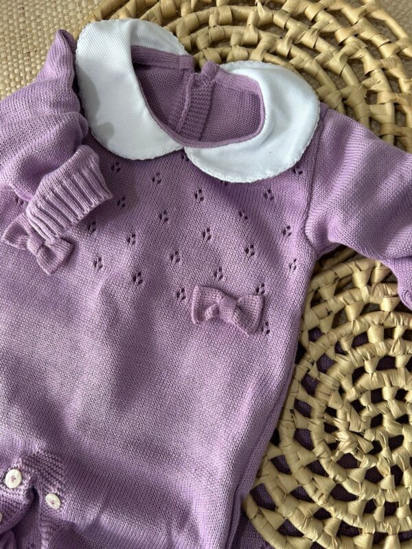 • Macacão em tricot com gola em tecido branco e abertura entrepernas para facilitar a troca do bebê;