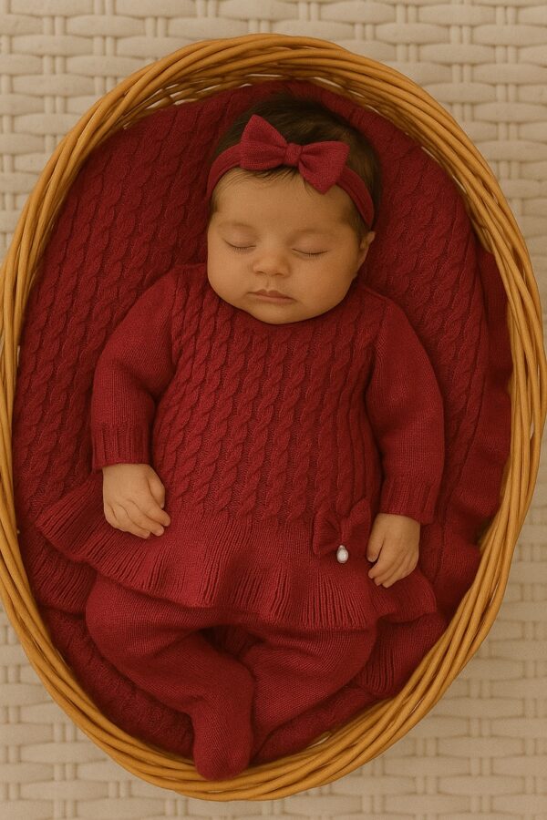 A Saída de Maternidade Manuela é sinônimo de elegância e aconchego para os primeiros dias da bebê. Produzida em tricot macio e confortável, traz um visual delicado com ponto trabalhado, babado na barra e laço com detalhe em pérola — um charme especial para marcar esse momento inesquecível.